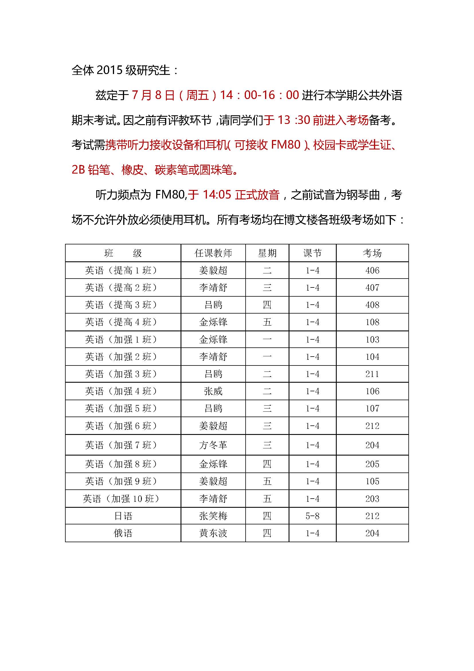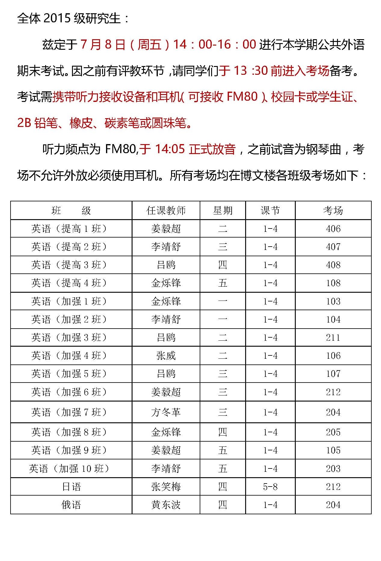 2015-2016第二学期公共外语期末考试考场安排