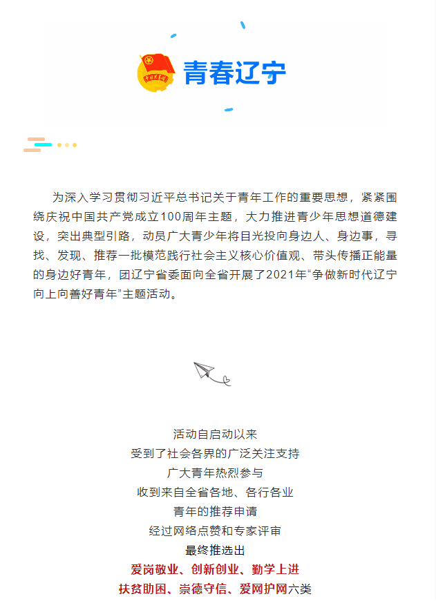 为深入学习贯彻习近平总书记关于青年工作的重要思想,紧紧围绕庆祝中国共产党成立100周年主题,大力推进青少年思想道德建设,突出典型引路,动员广大青少年将目光投向身边人、身边事,寻找、发现、推荐一批模范践行社会主义核心价值观、带头传播正能量的身边好青年,2021年上半年团辽宁省委面向全省开展了“争做新时代辽宁向上向善好青年”主题评选活动。