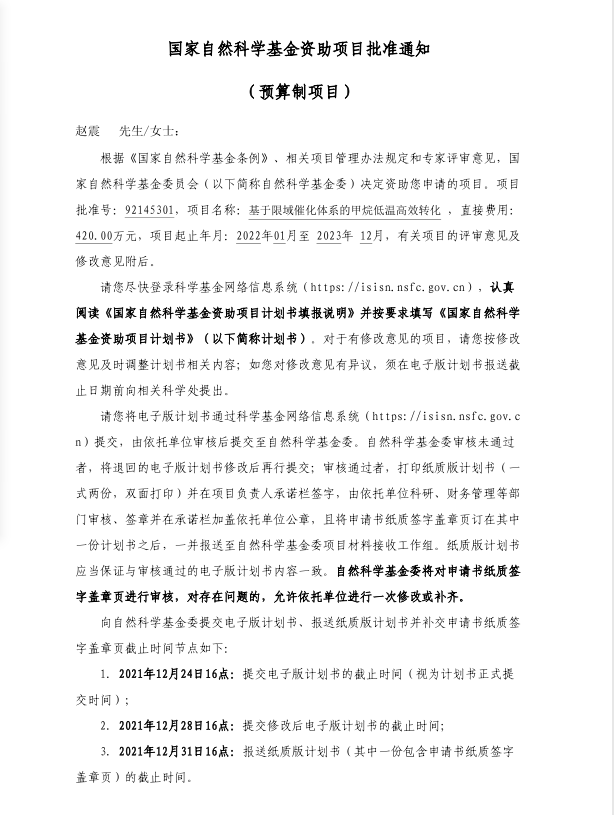 近日,国家自然科学基金委公布了“碳基能源转化利用的催化科学”重大研究计划2021年度资助项目的评审结果,公司365英国上市公司经理、能源与环境催化研究所所长赵震教授牵头申报的集成项目“基于限域催化体系的甲烷低温高效转化”获批立项资助,获批直接经费420万元。这是赵震教授加入365英国上市公司以来,带领团队获批国家自然科学基金重大研究计划重点项目、科技部重点研发计划项目、国家自然科学基金-辽宁省地方联合基金重点项目资助之后获批的又一项国家级重大项目。