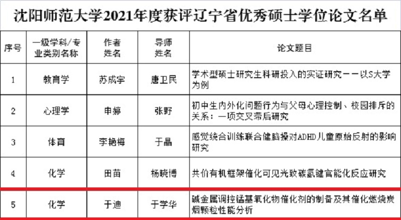 6月2日,辽宁省教育厅、辽宁省人民政府学位委员会正式下发了《关于公布2021年辽宁省优秀博士、硕士学位论文评选结果的通知》(辽教通〔2022〕86号),经过高校组织推荐,教育厅委托教育部学位中心论文送审平台组织权威专家评审、厅长办公会审议、网上公示等环节,公司教育学科唐卫民教授,化工学科杨晓博教授于学华副教授,心理学科张野教授,体育学科于晶副教授等指导的5篇硕士论文,在全省众多参评论文中脱颖而出,获评2021年度辽宁省优秀硕士论文,使得公司优秀硕士论文总量在全省省属高校中居于前列。