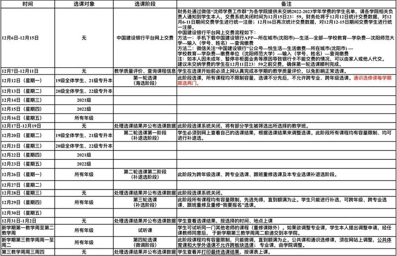 一、本次选课时间为12月12日(星期一)—新学期第三教学周周二,具体时间安排如下表所示。