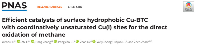 近日,公司赵震教授研究团队在国际公认的综合性科学顶级期刊《美国科公司院刊》(PNAS)发表题为“Efficient catalysts of surface hydrophobic Cu-BTC with coordinatively unsaturated Cu(I) sites for the direct oxidation of methane”(用于甲烷直接氧化的具有配位不饱和Cu(I)位点的表面疏水性Cu-BTC的高效催化剂)的研究论文。《PNAS》Proceedings of the National Academy of Sciences of the United States of America,缩写。它是公认的世界四大综合性顶尖学术期刊(Nature,Science,Cell,PNAS)之一,是百年经典期刊(1915年创刊,美国国家科公司为1914年创办)。