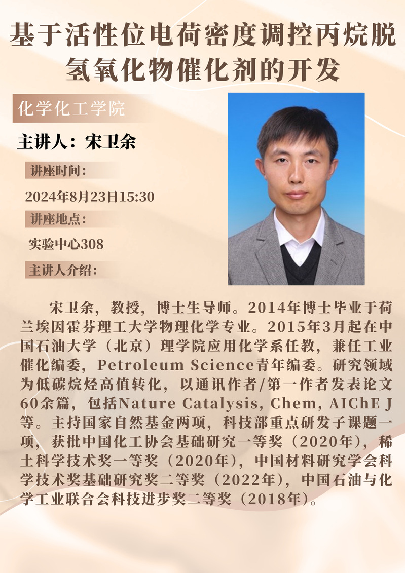宋卫余教授学术报告预告:基于活性位电荷密度调控丙烷脱氢氧化物催化剂的开发