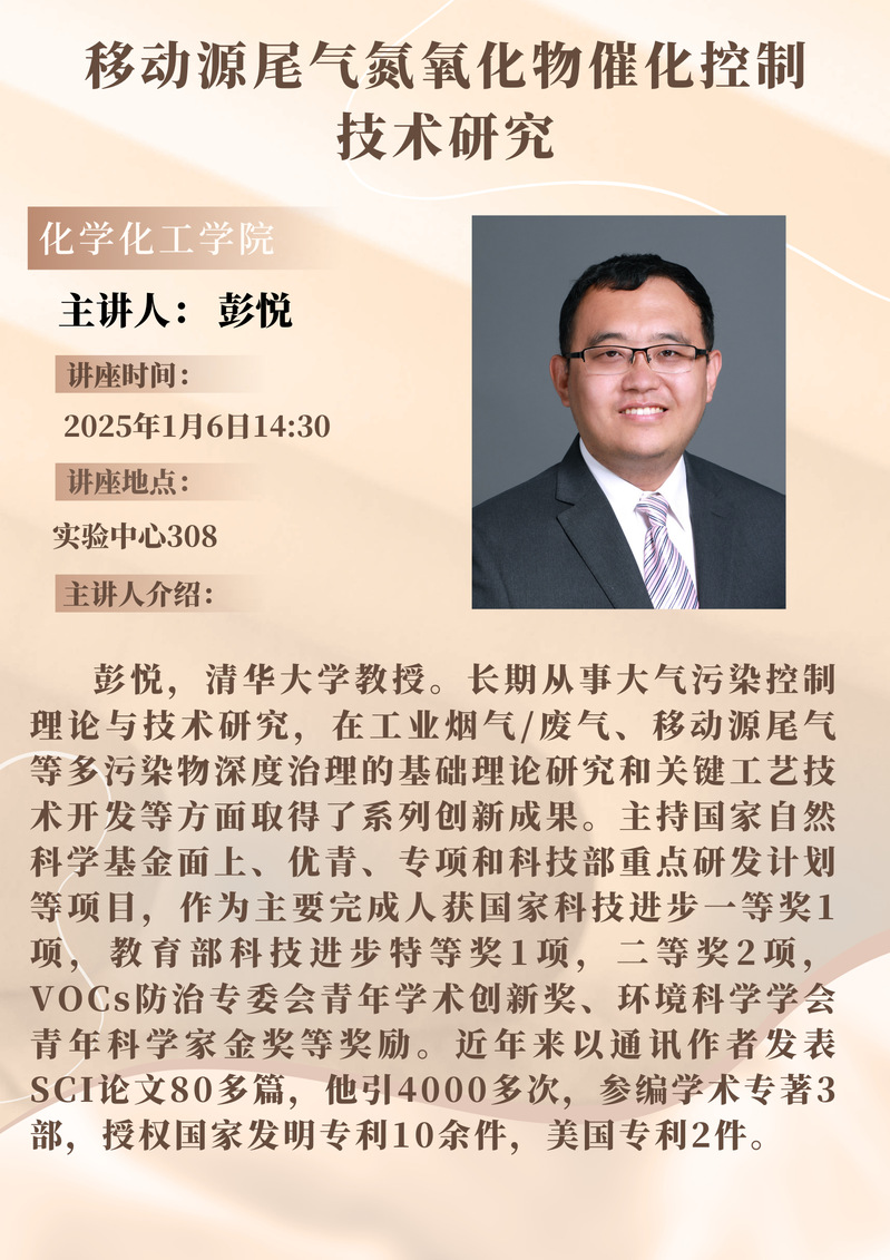 彭悦教授学术报告预告:移动源尾气氮氧化物催化控制技术研究