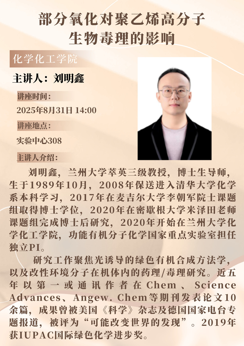刘明鑫教授学术报告预告:部分氧化对聚乙烯高分子生物毒理的影响